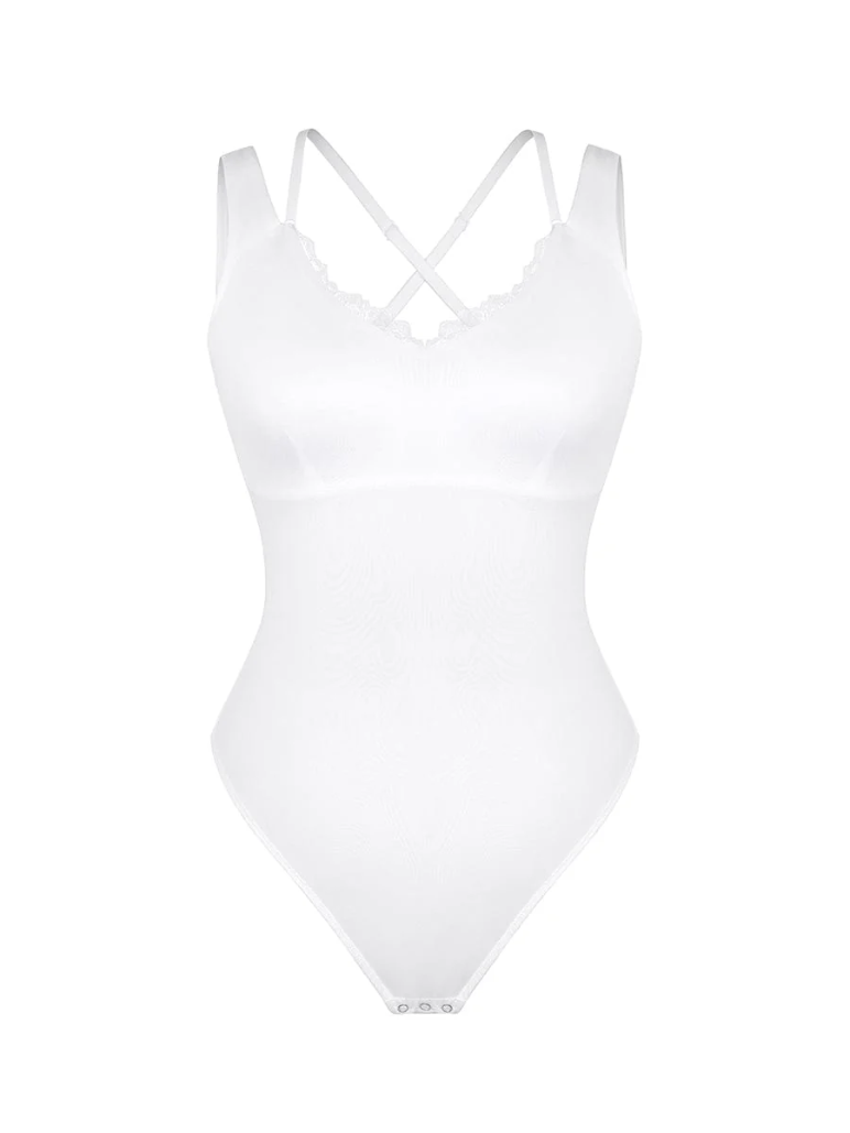 1. Escote de encaje: El escote de encaje y el profundo escote en V crean un efecto de dos piezas;